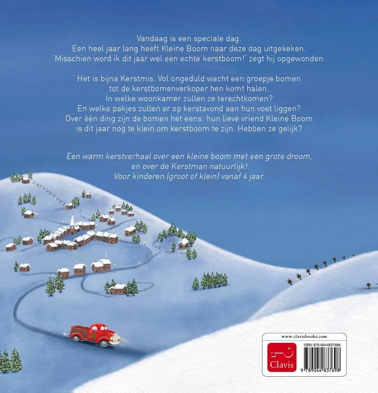 ‘Misschien word ik dit jaar wel een echte kerstboom!’ zegt hij opgewonden. Het is bijna Kerstmis. Vol ongeduld wacht een groepje bomen tot de kerstbomenverkoper hen komt halen. In welke woonkamer zullen ze terechtkomen? En welke pakjes zullen er op kerstavond aan hun voet liggen? Over één ding zijn de bomen het eens: hun lieve vriend Kleine Boom is dit jaar nog te klein om kerstboom te zijn. Hebben ze gelijk?