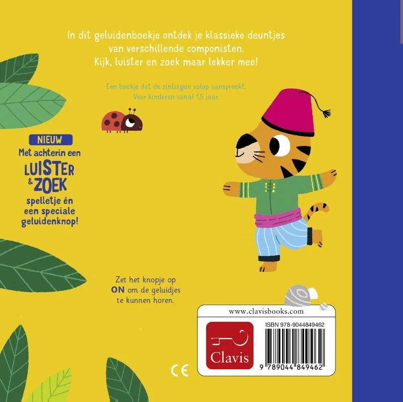 In dit geluidenboekje ontdek je de muziek van de grootste componisten. Kijk-, luister- én zoekplezier verzekerd! Een boekje dat de zintuigen volop aanspreekt. Voor kinderen vanaf 1,5 jaar.