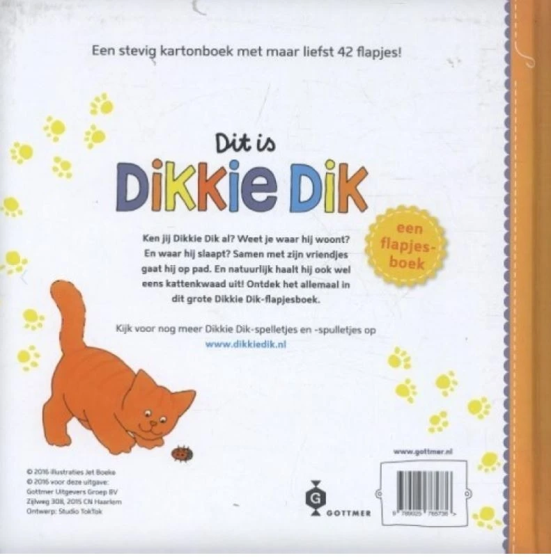 Jongens en meisjes, opgepast: dit is Dikkie Dik! De ondeugendste kater van Nederland krijgt zijn eigen grote flapjesboek. Het boek heeft een opbollend omslag en kartonnen pagina’s met lekker veel flapjes, waar Dikkie Dik en zijn vriendjes achter verschole