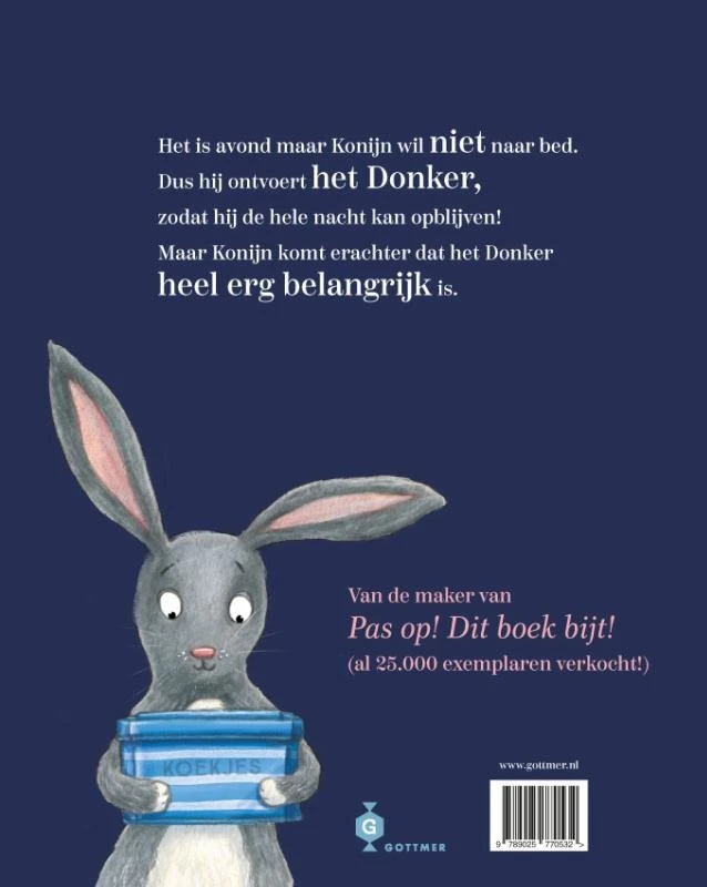 Konijn wil nog niet slapen Konijn heeft geen zin om te gaan slapen, maar het wordt alweer donker. Hij besluit het donker te vangen in zijn koektrommel. Als het niet donker is, hoeft hij ook niet te slapen
