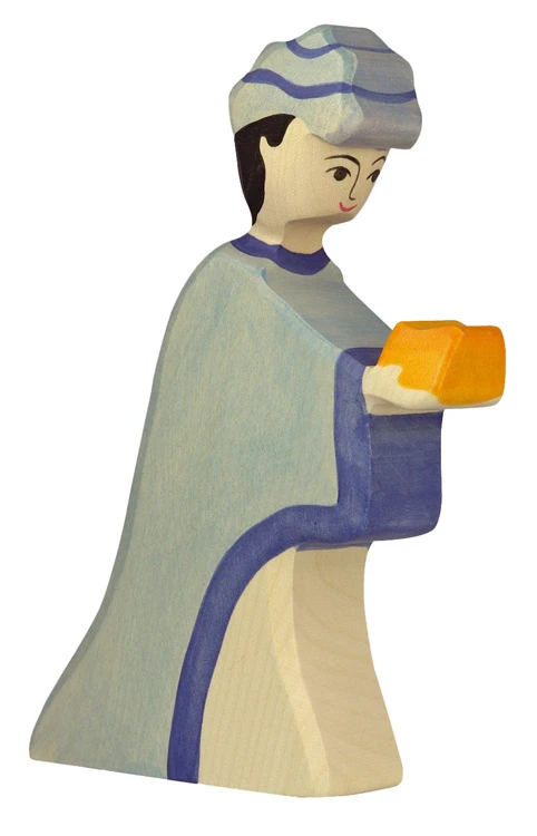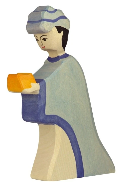 Dit is Caspar, een van hout gemaakt figuur van Holztiger. Tezamen met Balthasar en Melchior vormen zij de 3 wijzen. Hoogte 18 cm.