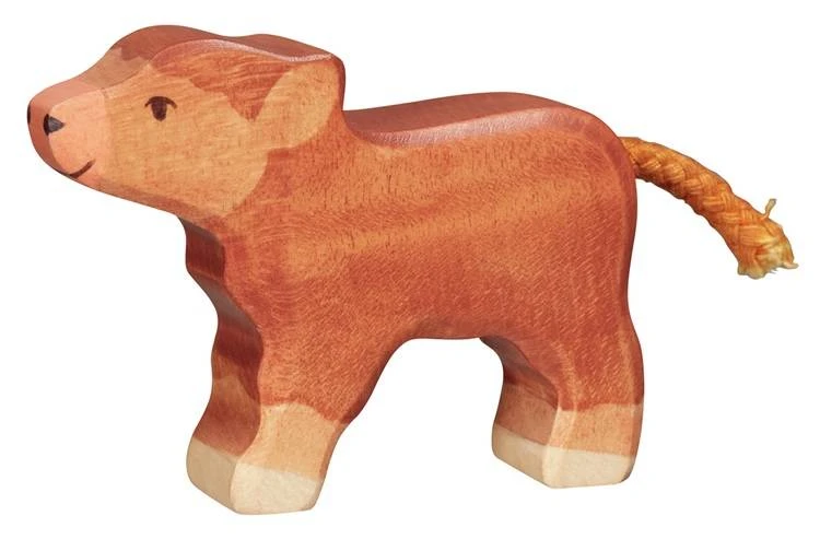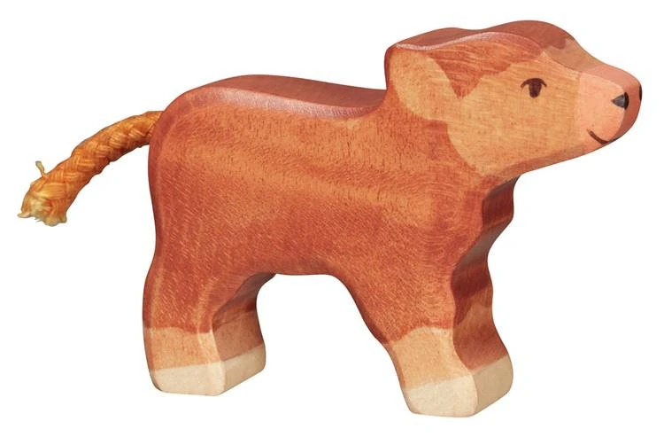 Dit is het kalfje van de Schotse hooglander. Dit kleine houten kalf van Holztiger heeft zijn kop recht vooruit en is klaar om melk te drinken bij de moeder. Afmeting: 7.2×1.9×5.5 cm