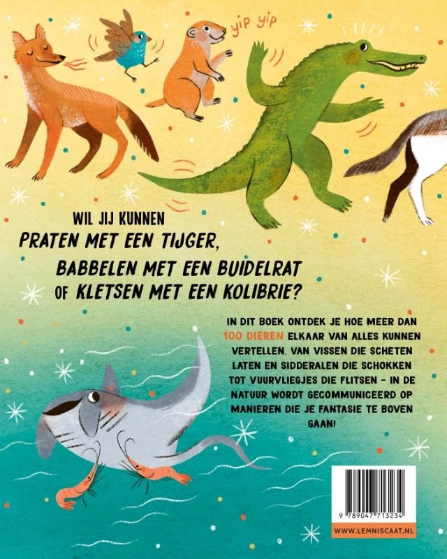 Hoewel dieren niet dezelfde woorden kennen als mensen, hebben ze wel allerlei redenen om te communiceren, net als jij: om eten te krijgen, om zichzelf in gevaarlijke situaties te beschermen, om hun liefde te tonen of om een ander te helpen. Maar dieren – en hun leefomgevingen – verschillen enorm, en de manieren waarop ze communiceren dus ook. Sommige manieren zijn vreemd, andere supergrappig, maar ze zijn allemaal van levensbelang: ze zorgen ervoor dat het dier, en uiteindelijk zijn hele soort, kan overleven. Vissen laten letterlijk scheten om in leven te blijven. Dat is een feit.