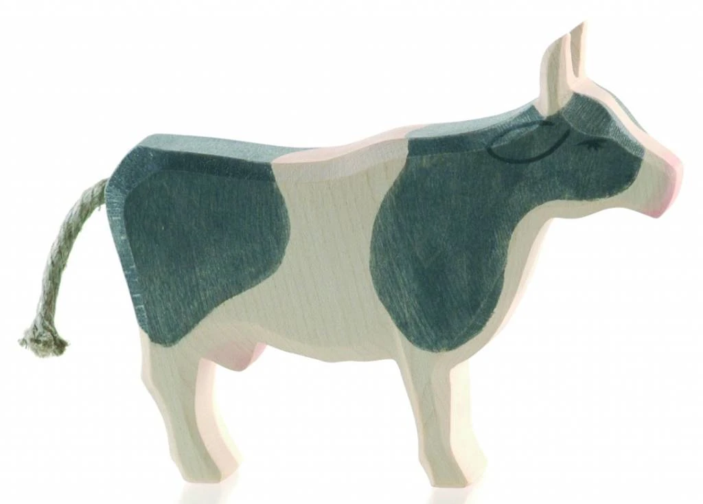 Deze zwart gevlekte koe staat met haar kop omhoog te kijken. Deze koe komt uit de serie boerderijdieren van ostheimer. Hoogte: 11.5 cm