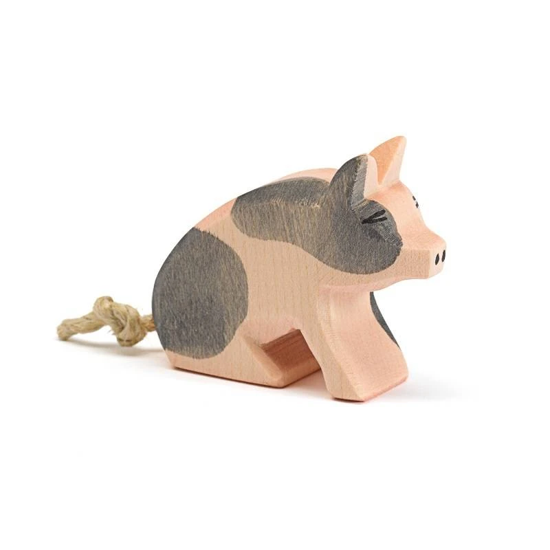 Deze met de hand, uit hout gesneden big van Ostheimer komt uit de serie boerderijdieren. Deze big is lekker lui gaan zitten en is gevlekt. Hoogte: 4.5 cm