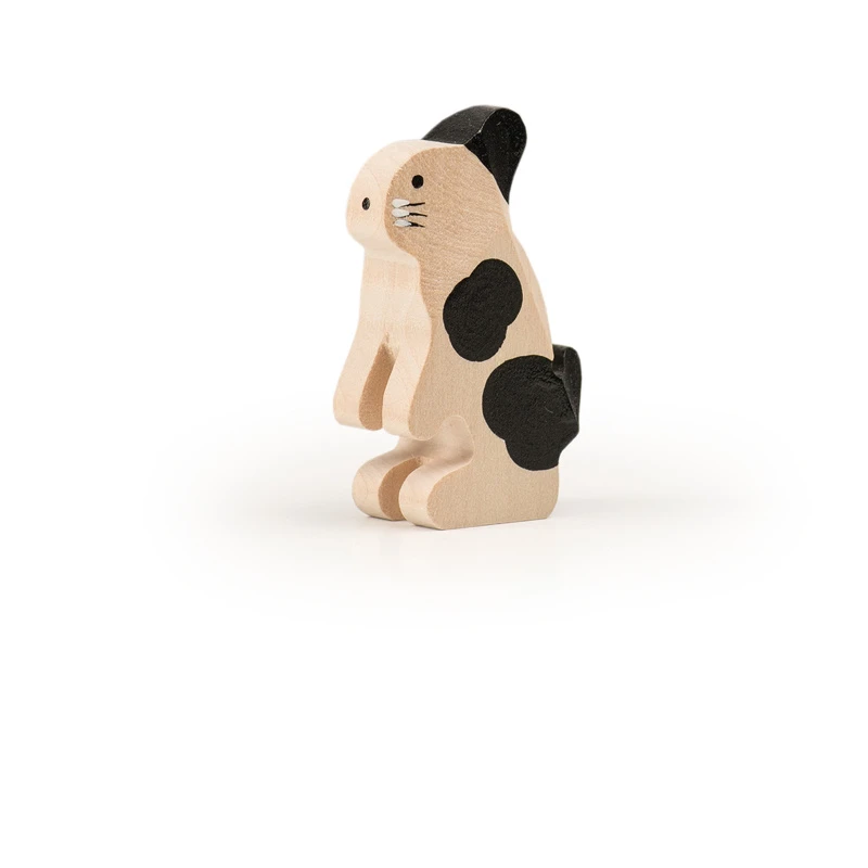 Deze haas van Trauffer staat rechtop en is met de hand gemaakt van lindehout in Zwitserland, de gebruikte verf is vrij van chemicaliën. De haas is robuust genoeg om mee te spelen. Hoogte: 5 cm.