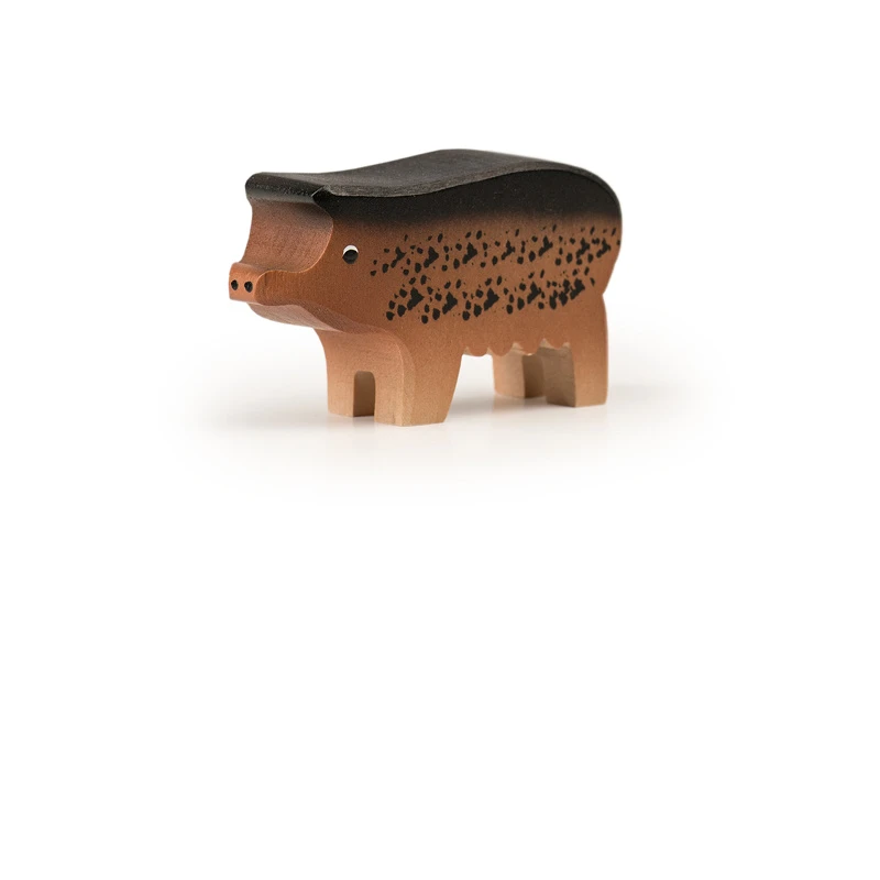Dit wolvarken van Trauffer staat rechtop en is met de hand gemaakt van lindehout in Zwitserland, de gebruikte verf is vrij van chemicaliƫn. Het varken is robuust genoeg om mee te spelen. Hoogte: 4 cm.