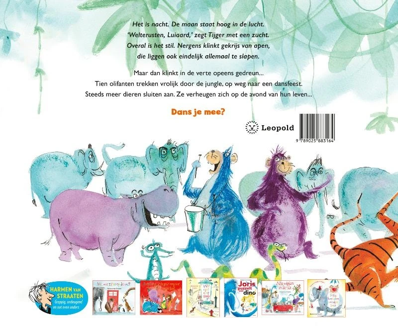 Maar dan klinkt in de verte opeens gedreun… Tien olifanten trekken vrolijk door de jungle, op weg naar een dansfeest. Steeds meer dieren sluiten aan. Ze verheugen zich op de avond van hun leven… Dans je mee? Aanstekelijke humor op rijm van Harmen van Straaten, de maker van Hé, wie zit er op de wc?