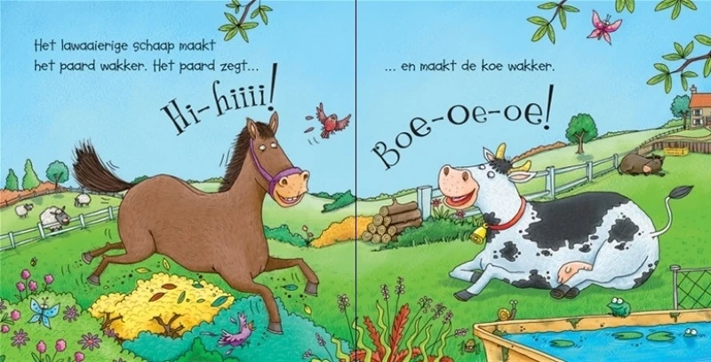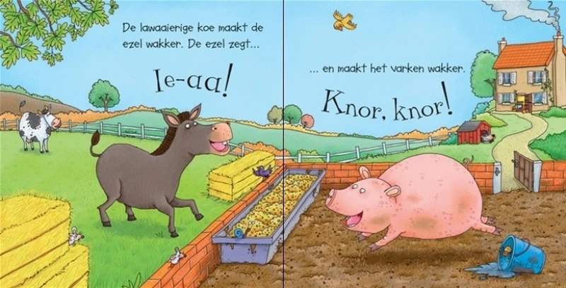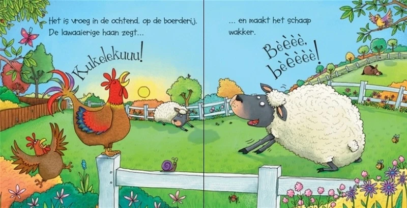 In dit geluidsboekje komt de boerderij tot leven. Één voor één worden de dieren op de boerderij wakker en maken ze geluid. Met een haan, schaap, koe en nog veel meer.