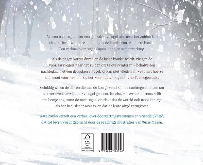 Ze kan niet vliegen en weet niet hoe ze zich moet voorbereiden op het weer dat ze nog nooit heeft meegemaakt. Gelukkig willen de dieren die aan de kou gewend zijn de nachtegaal helpen om te overleven, terwijl haar vleugel geneest. De winter is zwaar en soms zelfs een beetje eng, maar de nachtegaal ontdekt dat de wereld ook mooi kan zijn als het heel slecht weer is, en dat de lente altijd terugkomt. Kate Banks vertelt een verhaal over doorzettingsvermogen en vriendelijkheid, dat tot leven wordt gebracht door de prachtige illustraties van Suzie Mason.