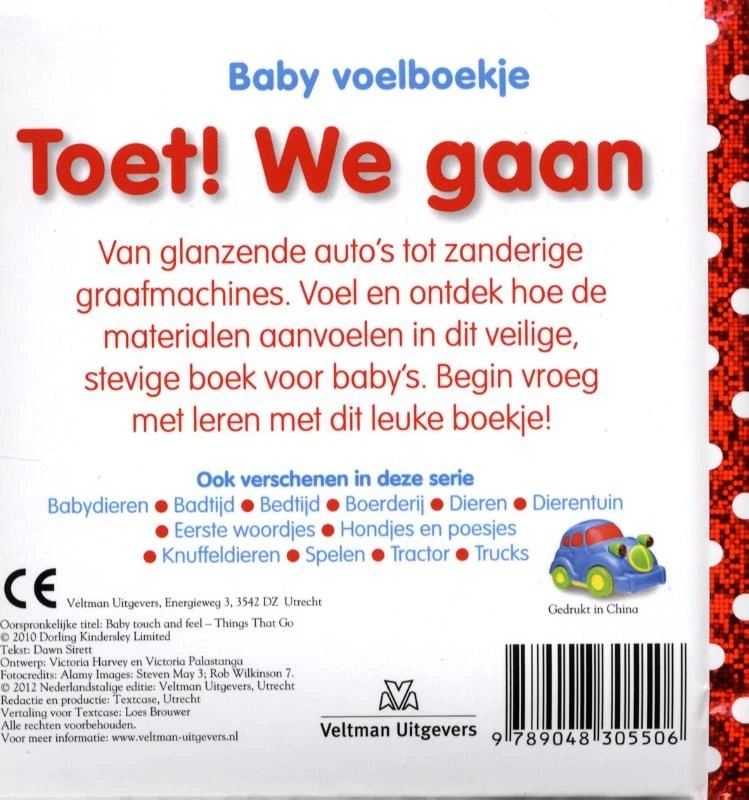 Van glanzende auto’s tot zanderige graafmachines. Voel en ontdek hoe de materialen aanvoelen in dit veilige, stevige boek voor baby’s. Begin vroeg met leren met dit leuke boekje!