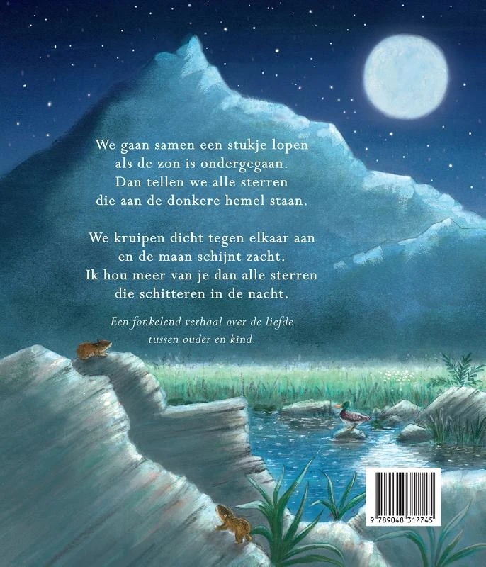We gaan samen een stukje lopen als de zon is ondergegaan. Dan tellen we alle sterren die aan de donkere hemel staan. We kruipen dicht tegen elkaar aan en de maan schijnt zacht. Ik hou meer van je dan alle sterren die schitteren in de nacht.