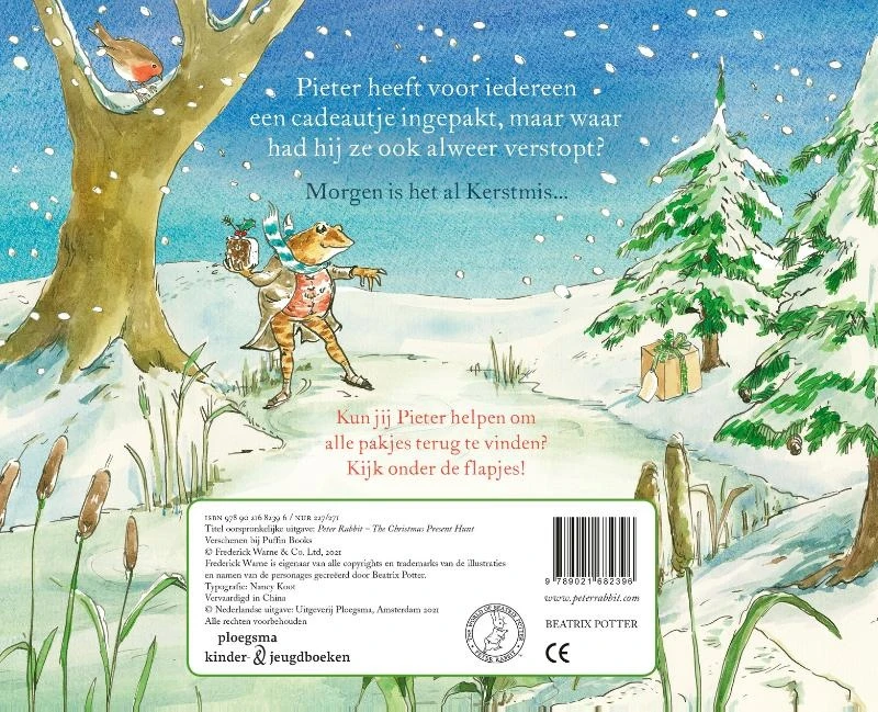 Pieter Konijn heeft de cadeautjes voor zijn moeder en zusjes ergens verstopt, maar waar ook alweer? Morgen is het al Kerstmis… Samen met de lezer gaat hij op zoek in het bos. Maar door de sneeuw ziet alles er ineens heel anders uit. Kijk onder de flapje